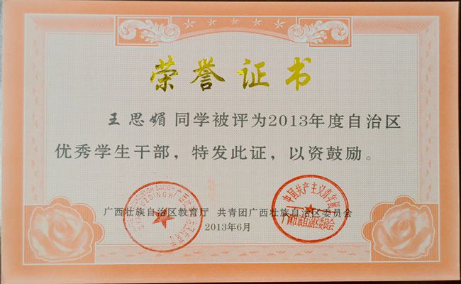 今年我院在学生综合素质教育工作上再次取得突出成绩。在2013年度自治区先进班级、优秀学生干部、三好学生和优秀学生的评比中,我院2011级电脑财会班、2011级汽车检测与维修技术预备技师班被评为先进班集体,王思媚、李月妮、沈丕财3位同学被评为优秀学生干部,卢志明、黄玉飞、杨海杰、张钰琦、凌钦、吴琼、李萍7位同学被评为自治区三好学生,李晨同学获得了自治区优秀学生称号。学生工作处于10月28日上午在灯光球场举行颁奖仪式,为获得荣誉的班级和同学进行了颁奖及表彰,并号召全院同学们向他们学习,不断进取,争取获得更大的进步。