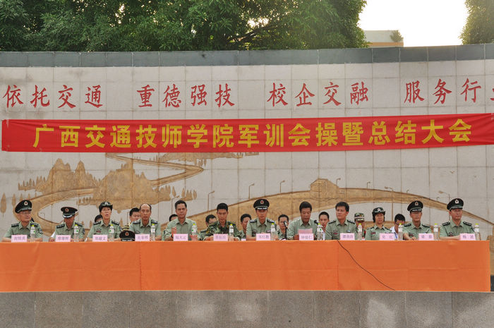 广西武警一支队队长覃振周在发言中说,在军训中同学们做到:一、服从命令,听从指挥,能够遵守各项纪律规定,认真刻苦的进行各项训练;二、训练效果有明显提高。在军训期间,每名教官能在短时间、任务重的情况下精心准备,严格管理训练。通过训练,同学们有了很大的进步。能够做到内务统一,队列动作整齐划一;三、集体荣誉感较强。班兴我荣,班衰我耻。在军训期间,每个班都表现出了比较强的集体意识、配合意识、协作意识,“顾大局、识大体”的意识较强。他希望同学们今后能继续发扬军训中刻苦、拼搏、积极向上、团结一致的精神,在学习生活中取得更优异的成绩。