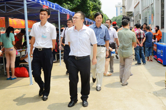 学院韦红教院长(左一)陪同自治区人社厅职业能力建设处覃朝俊副处长(左二)、陈振成主任(左三)视察我院迎新工作
