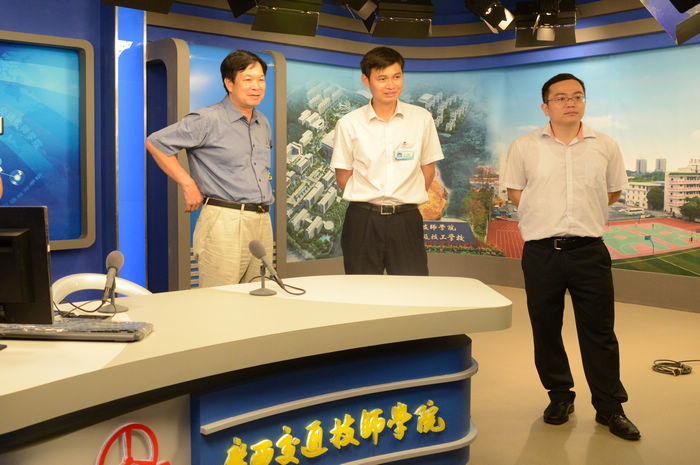 学院韦红教院长陪同自治区人社厅职业能力建设处覃朝俊副处长、陈振成主任参观我院演播厅