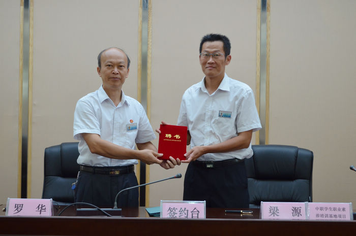 图十:罗华书记为“中职学生职业素养培训基地” 项目负责人梁源颁发聘书