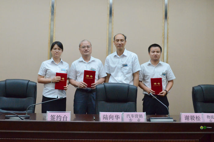 图十二:关菲明副院长为“汽车营销专业”、“物流管理专业”主要负责人封桂炎、陆向华、谢毅松颁发聘书