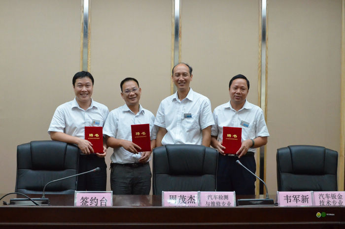 图十一:关菲明副院长为“汽车检测与维修专业”、“汽车与钣金技术专业”主要负责人樊海林、周茂杰、韦军新颁发聘书
