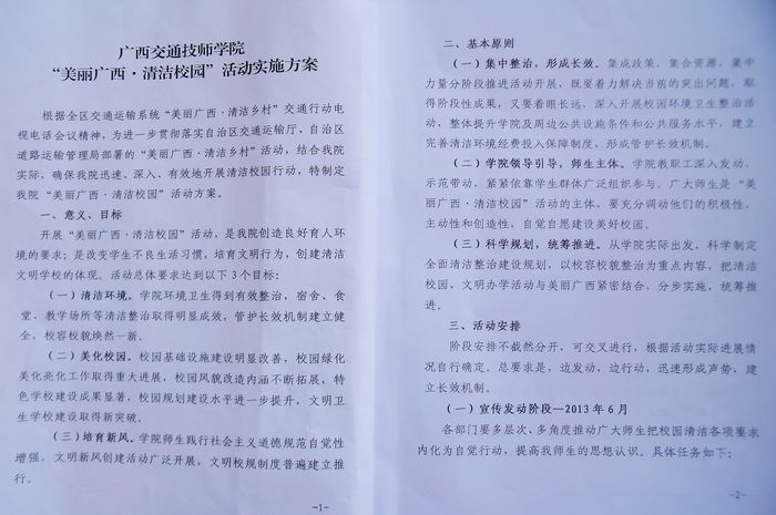 为进一步贯彻落实广西自治区交通运输厅、自治区道路运输管理局部署的“美丽广西·清洁乡村”活动,我院根据相关会议精神并结合具体实际,制定了《广西交通技师学院“美丽广西·清洁校园”活动实施方案》(以下简称活动方案),以确保我院迅速、深入、有效地开展清洁校园活动。