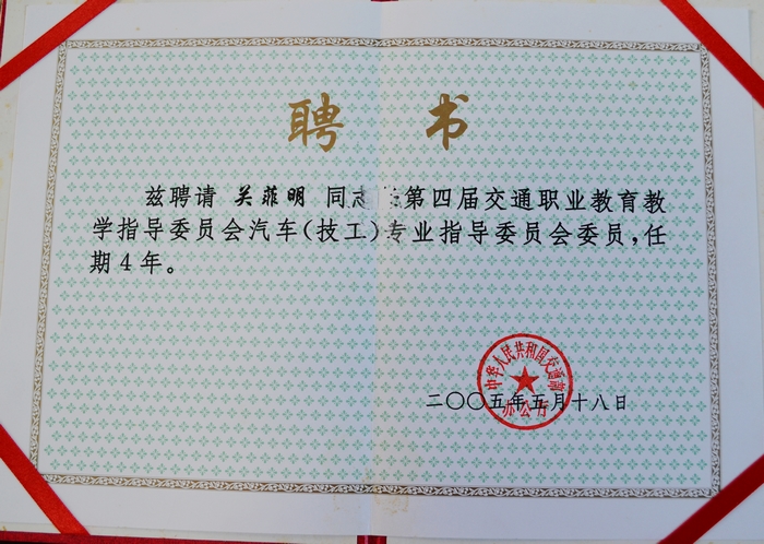 图二:关菲明副院长2005年荣任交通运输职业教育教学指导委员会委员的聘书