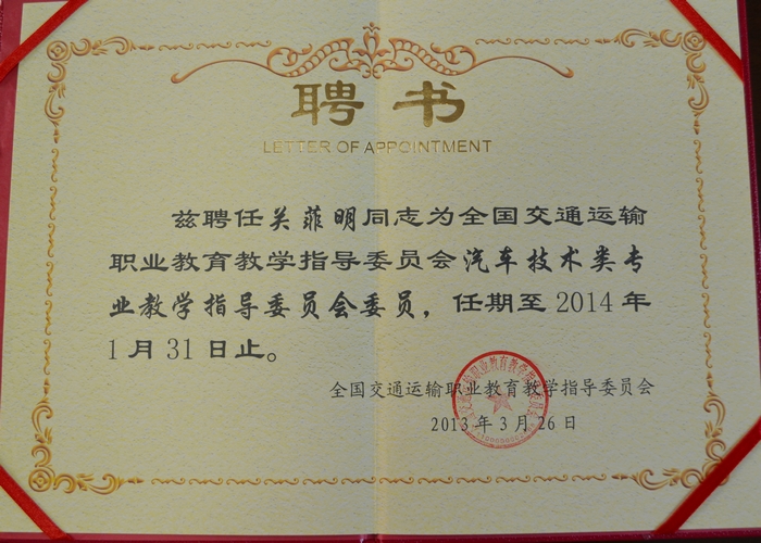 根据《教育部关于调整和增设全国行业职业教育教学指导委员会的通知》(教职成函〔2012〕9号),交通运输部于2013年3月调整了新一届交通运输职业教育教学指导委员会(下称“交指委”)委员组成,我院关菲明副院长继续荣任交指委委员。