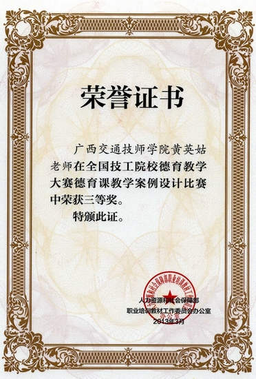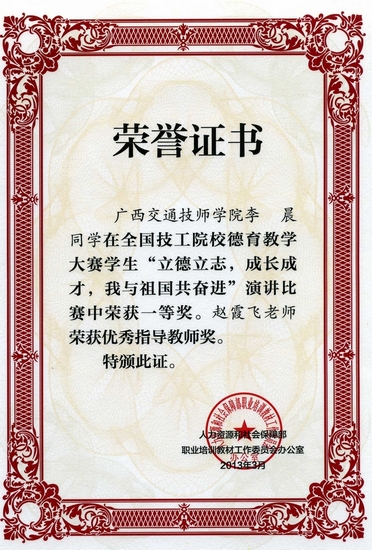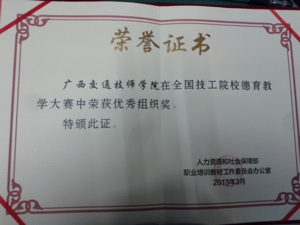 在我院院领导的深切关怀下,基础学科部负责组织我院德育教师和学生参与比赛。通过3个月的精心准备,历经全区评比推荐,全国决赛等环节的层层角逐,我院师生在全国技工院校德育教学大赛中成绩异常突出:学院获优秀组织奖;在演讲比赛项目23个一等奖中斩获2名;德育课教学案例设计比赛项目5位老师中4位获奖。具体获奖情况如下: