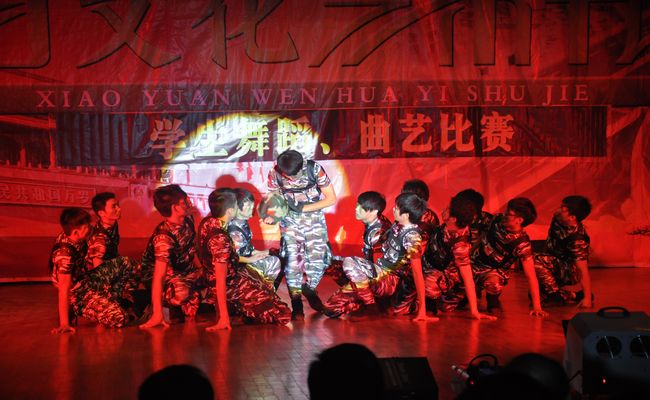 图一:2010级汽车检测与维修高级工7班舞蹈《中国军魂》