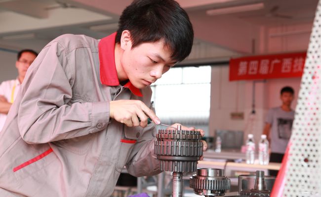 图6:我院参赛选手冯光华在比赛中沉着操作(荣获汽车修理工职业技能竞赛广西第一名)