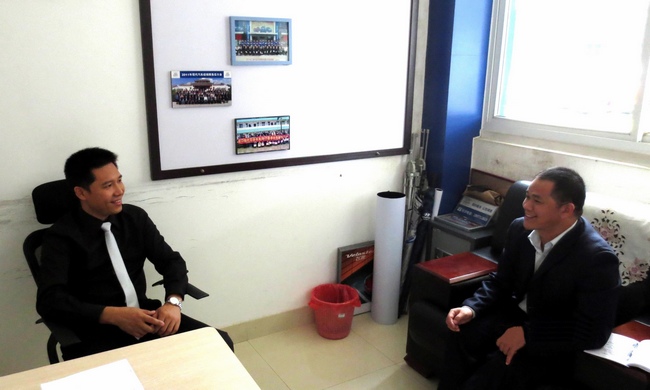 图5 梁振华副主任向北京现代桂林顺景特约销售服务店技术总监全石健了解毕业生工作情况