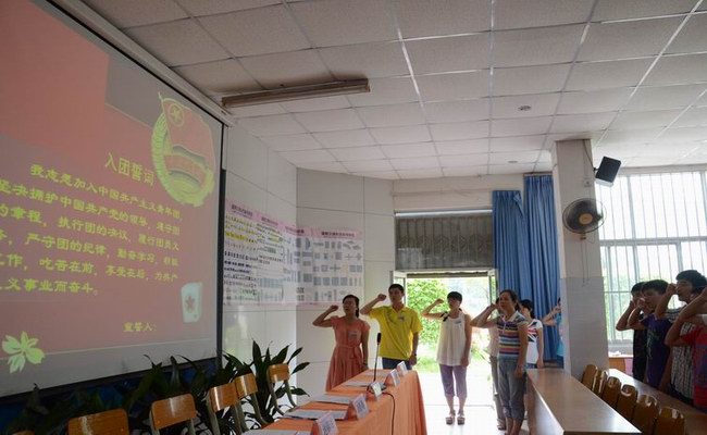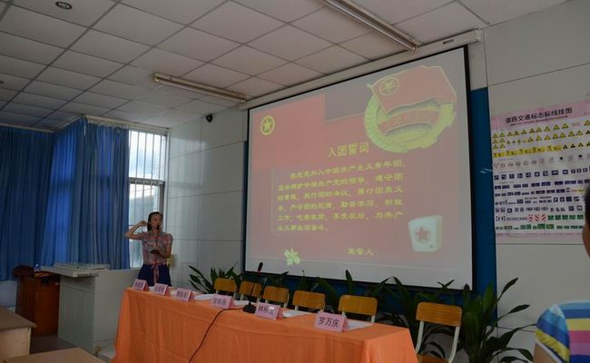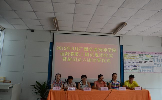 6月18日中午,在学校阶梯教室,校团委为学校适龄教职工团员退团和新团员入团举行了简短而隆重的仪式。出席仪式的领导和老师分别是广西交通高级技工学校团委书记李姜春老师、团委副书记甘麒燕老师、组织委员赵春玲老师、文体委员罗万庆老师、宣传委员黎晓耘、徐文芽老师和信息与商务系林柳波、滕松蓉老师。仪式由团委副书记甘麒燕老师主持。