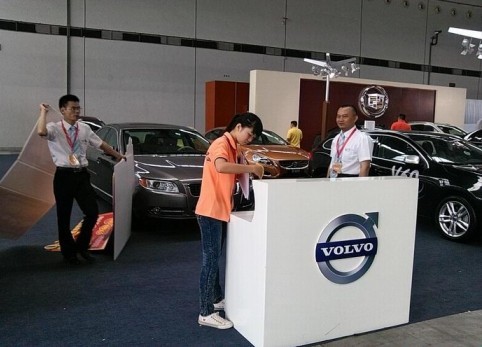 图三:学生志愿者为沃尔沃汽车品牌做好车展前准备工作