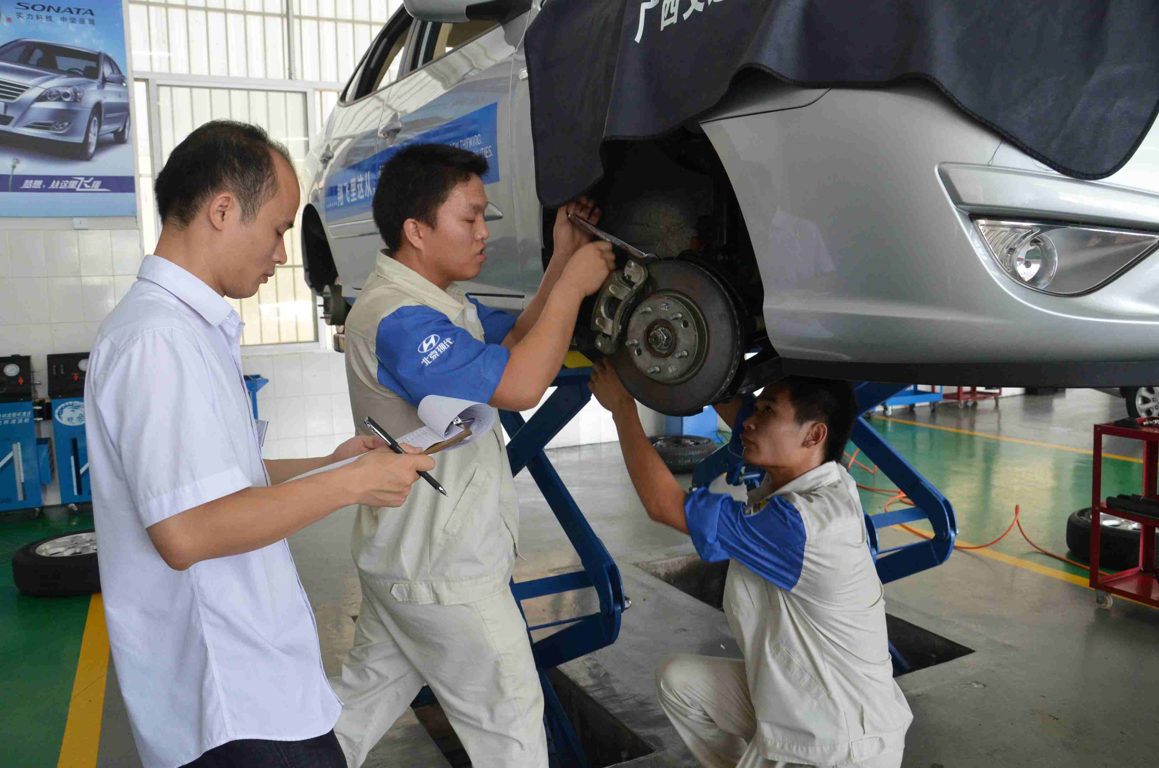 据悉,此次理论考试为期1小时,在学校2号教学楼102教室进行。操作考试为期近6小时,在学校实训楼1楼北京现代班实训场地。考核内容包括15000公里汽车维护必考项及节气门清洗、灯光故障排除、节温器检修、正时皮带拆装等71项目。考场上同学们一丝不苟,熟练地按考核内容逐项完成任务,只见汽车维护项目中,2人一组的两位学生默契配合,分工明确,有序进行相关操作考试;单项考试的考生按操作项目的考核步骤逐项完成。本着公平、公正、严肃的原则,本次考试考试监考工作由北京现代总机厂培训科、北京现代班核心教师、玉柴集团广西通源北京现代4S店技术负责人三方共同完成,其中,广州市交通技师学校和我校分别派出一名北京现代班核心教师到对方学校进行监考。此次考试,考出了我校学生的水平,也向企业展示了我校的教学成果。