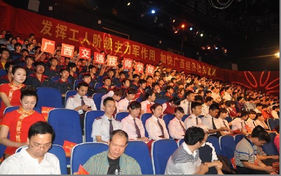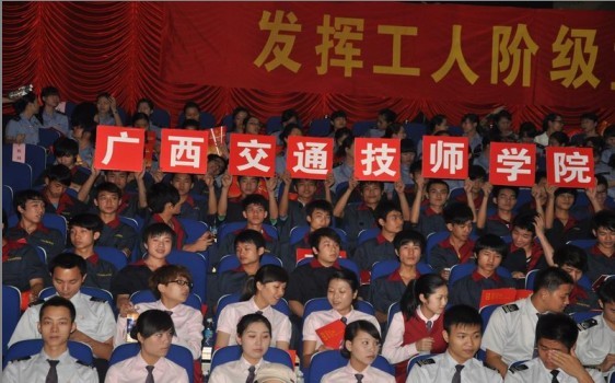 4月27日晚8点,广西电视台一号演播厅座无虚席,我校50名学生代表服装整齐,兴致勃勃地观看在此举办的“光荣属于劳动者——自治区总工会庆祝2012年‘五一’国际劳动节文艺晚会”。