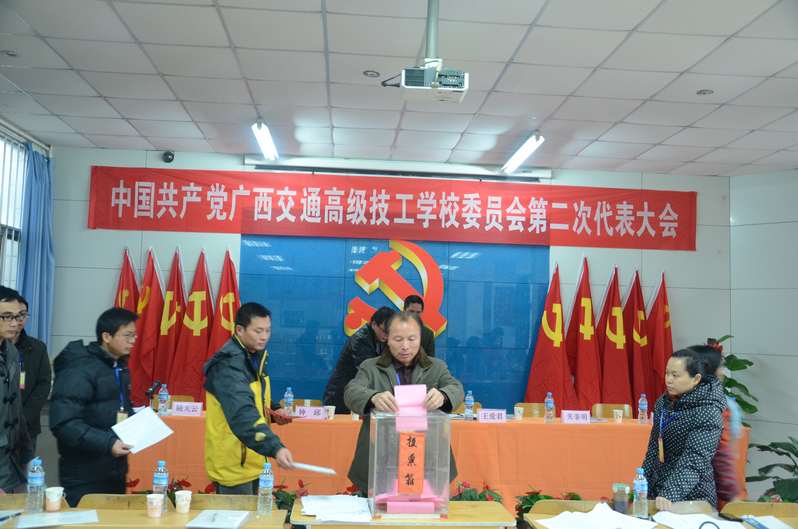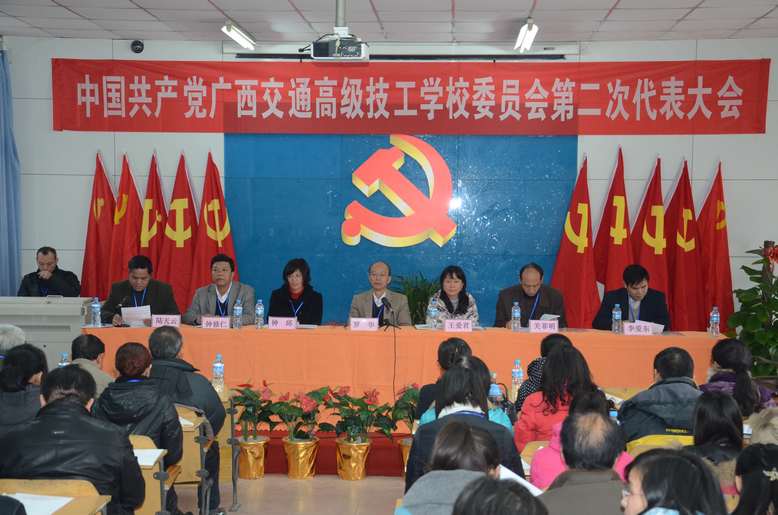 2012年1月9日下午,中国共产党广西交通高级技工学校委员会第二次代表大会在学校阶梯教室隆重召开。自治区道路运输管理局党委书记孙永生、党委办公室主任王爱君、人事科科长钟邱等上级单位党委领导,中共广西交通高级技工学校第一届委员会全体委员以及来自学校各党支部的党员代表参加了本次会议。