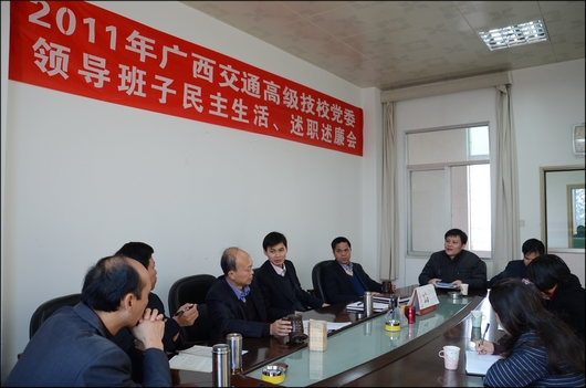 12 月 26 日上午,学校党委在办公楼6楼会议室召开党委领导班子2011年度民主生活、述职述廉会。自治区道路运输管理局党委办公室主任王爱君、人事科科长钟邱莅临指导。