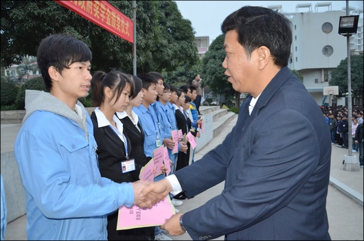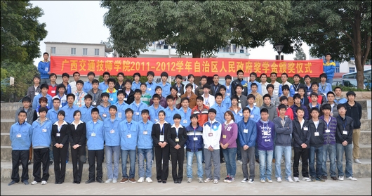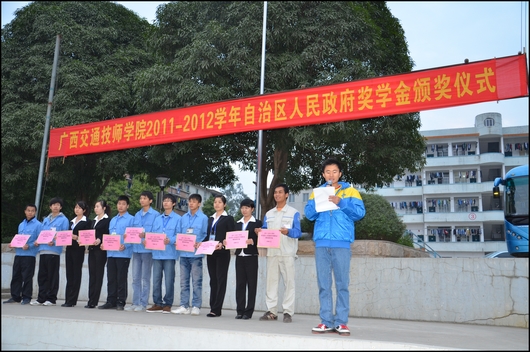 2011年12月16日上午,广西交通高级技工学校“2011—2012学年自治区人民政府中等职业教育奖学金颁奖仪式”在灯光球场隆重举行。会议由学生工作处副主任陆佳主持,学校钟修仁副校长、学生工作处相关领导、各班级的班主任、97名获奖学生代表以及全校学生参加了颁奖仪式。