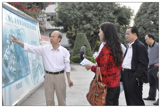 图二 罗华书记向前来参观的领导介绍学校伊岭校区规划图