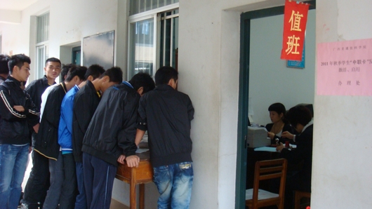 2011年10月29日,学校学生工作处办公室前人潮涌动,热闹非凡。2011级新生持有效证件排成长龙井然有序地办理用于发放助学金补的中职学生资助卡激活手续。进入校园服务的中国工商银行工作人员一一为前来领卡的学生办理签领手续,并耐心指导学生激活、启用中职学生资助卡。