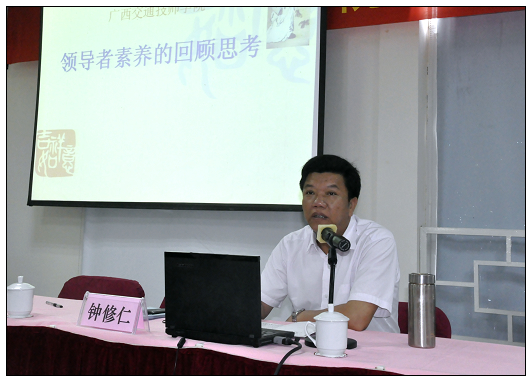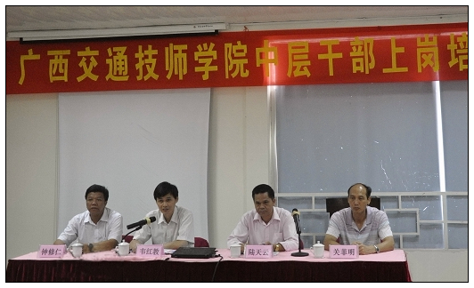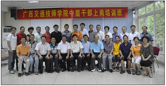 2011年6月10日至12日,广西交通技师院中层干部上岗培训班在南宁郊区大王滩举行。这次培训班是学校多年来首次举办,由四位校领导亲自授课,针对全体中层干部的集中培训。同时,也是该院第四轮全员竞聘上岗结束后,校领导为新一届中层干部提供的一次业务交流与学习的机会。广西交通高级技工学校校长韦红教在6月10日下午的开班仪式上说:“将本次培训的地点专门选在远离喧哗、环境清静的地方,目的是为各位干部创造一个贴近实际、放松身心,加强交流的平台,以更好地集中精力、认真学习、积极思考,从而利于大家对形势的把握和自身素质修养的提高。”