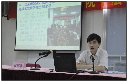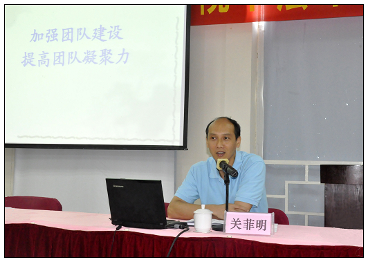 6月11日上午,钟修仁副校长和关菲明副校长分别就职业素养和团队合作等问题做了题为《领导者素养的回顾思考》和《加强团队建设,提高团队凝聚力》的专题讲座。两位校领导从学校的实际出发,结合当前形势,向各位中层干部分享了自己多年来的工作经验,言谈亲切、内容实用、耐人寻味。钟副校长指出,学校工作任务的完成需要有一支思想过硬有领导能力和水平的干部队伍,培训对干部显得尤为重要。新提拔的同志要尽快实现由被领导者向领导者的角色转变;全面熟悉掌握本部门的工作,准确组织、指导、协调被领导者工作;增进沟通,相互支持,加强团结,形成合力,打造团队;善于学习,努力提高自身的业务水平和协作能力等力争在十个方面提高自身素养。关副校长提出,如何管理团队,激励团队发挥最大作用、最高效率,是作为一个领导干部需要认真思考的问题。在工作中要善于用人,善于沟通,有求才之渴,有用才之能,有育才之道,有励才之术,有容才之量,有荐才之德,有护才之魄。