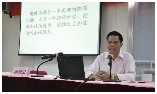 接着,陆天云副书记、副校长就领导干部的党风廉政建设工作做了《廉洁自律,做到“十有”》的专题讲座,主题鲜明、语重心长、发人深省。举古今中外之生动事例,引经据典,通过对国内外反腐败形势的分析阐明观点,提出要求。陆副书记在讲话中提及,在反腐败领域,教育系统也不是一方净土,广西壮族自治区检察院进行过一次调查,仅2003年1月至2004年7月,广西检察机关就立案侦查教育系统贪污贿赂等职务案件218件,涉案243人,涉案金额达2371万元。区内外一些院校干部行贿受贿的案件给我们敲响了警钟,我们必须廉洁自律,洁身自好,做到“十有”,管住自己。