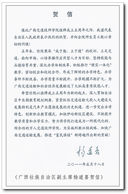 广西壮族自治区副主席杨道喜发来贺信
